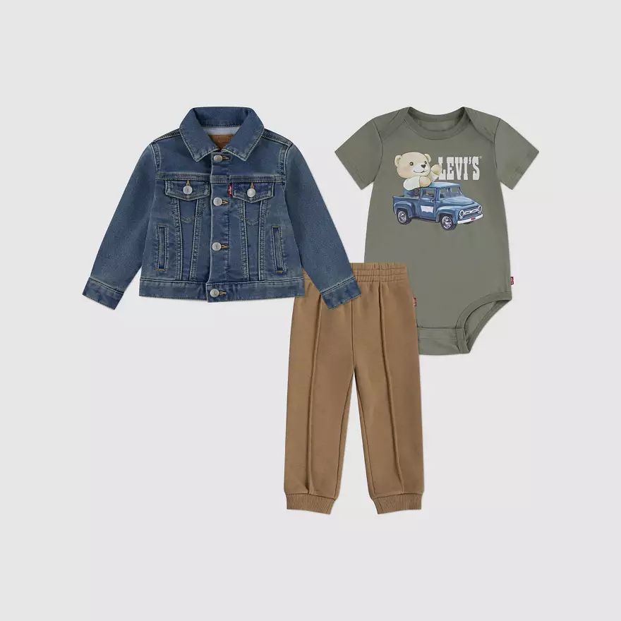 Pour votre prochaine aventure, prenez cet adorable ensemble Levi's®, comprenant un joli body, la légendaire veste Trucker et un jogger confortable ! Trop cute et confortable, cet ensemble est parfaitement cosy pour les plus jeunes. Ils pourront même le porter avec d’autres pièces de leur placard. Quelle bonne surprise !