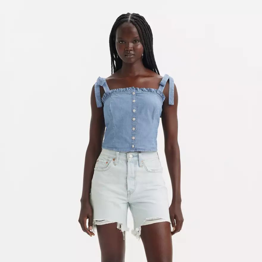 Cette Blouse Luciana ravissante présente des bretelles à nouer, un boutonnage sur le devant et un liseré à volants.