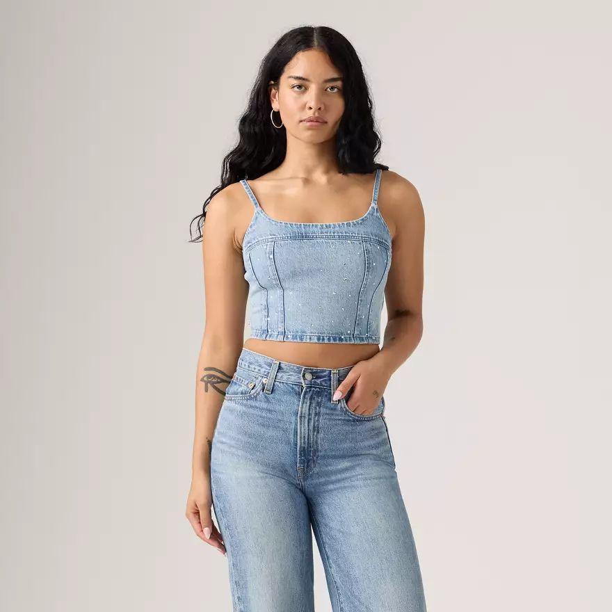 Un caraco intemporel. Notre débardeur Jadine Denim Cami présente une charmante encolure dégagée, des bretelles fines et réglables et une coupe crop moulante.