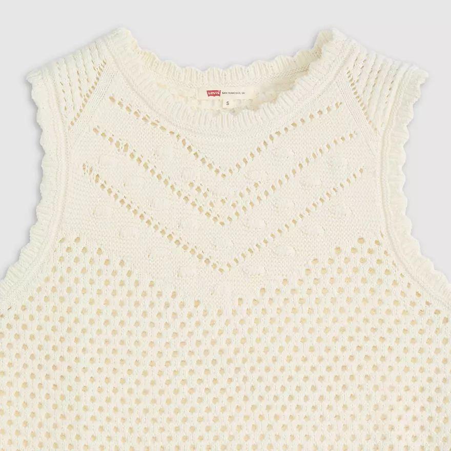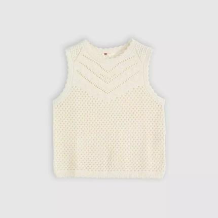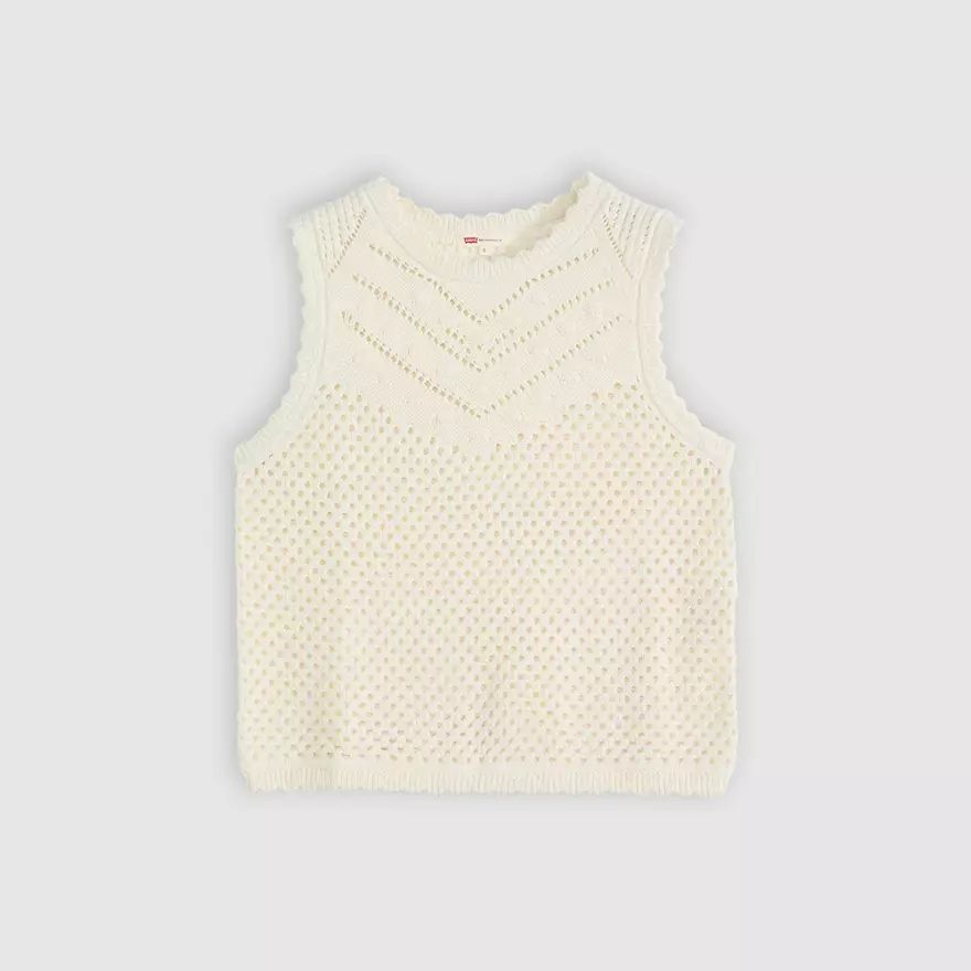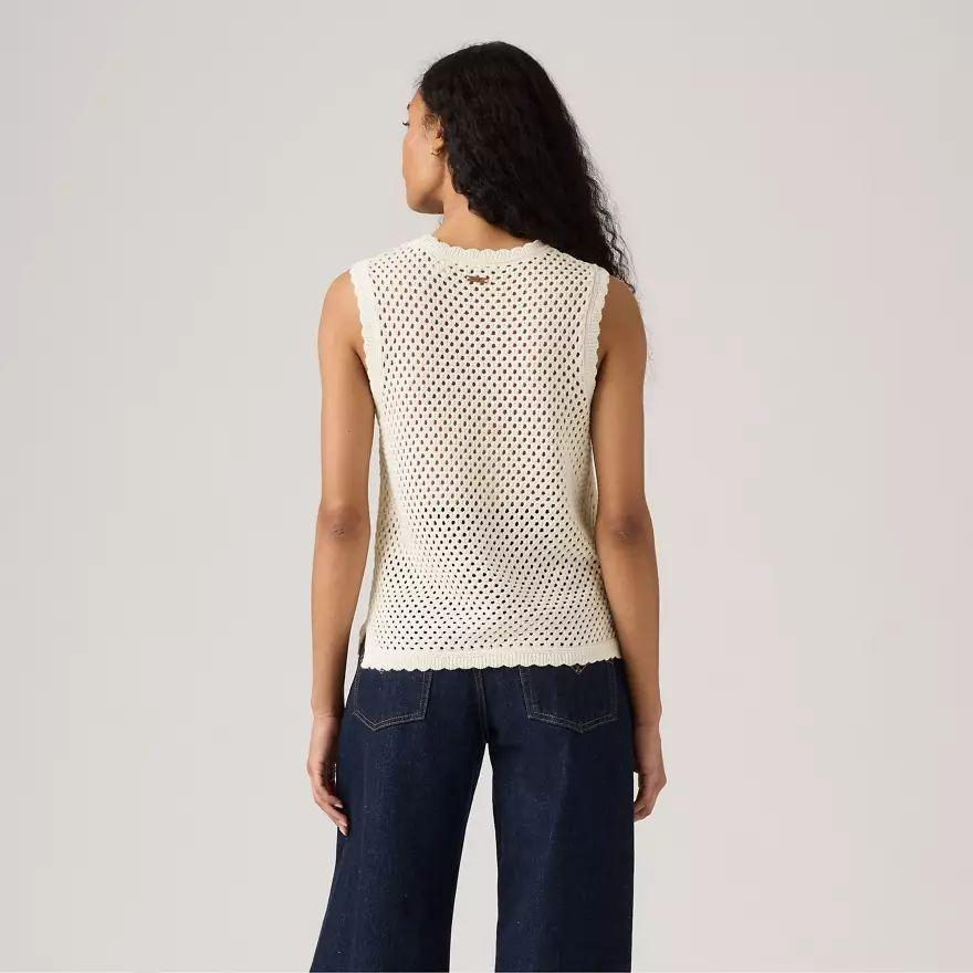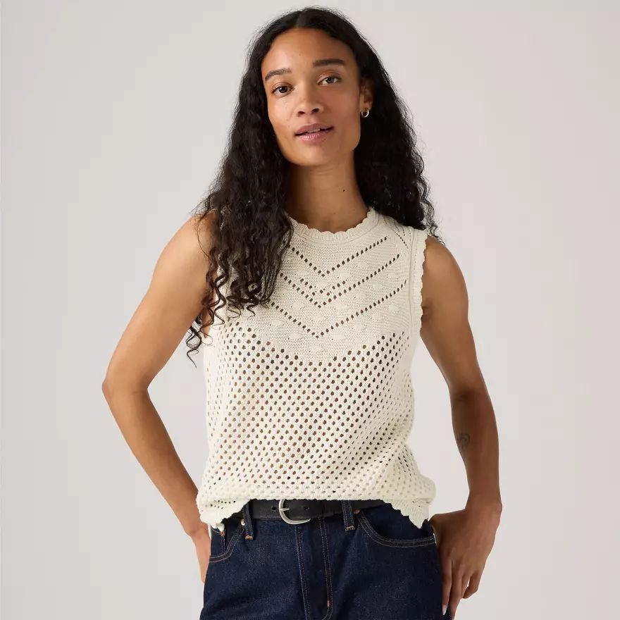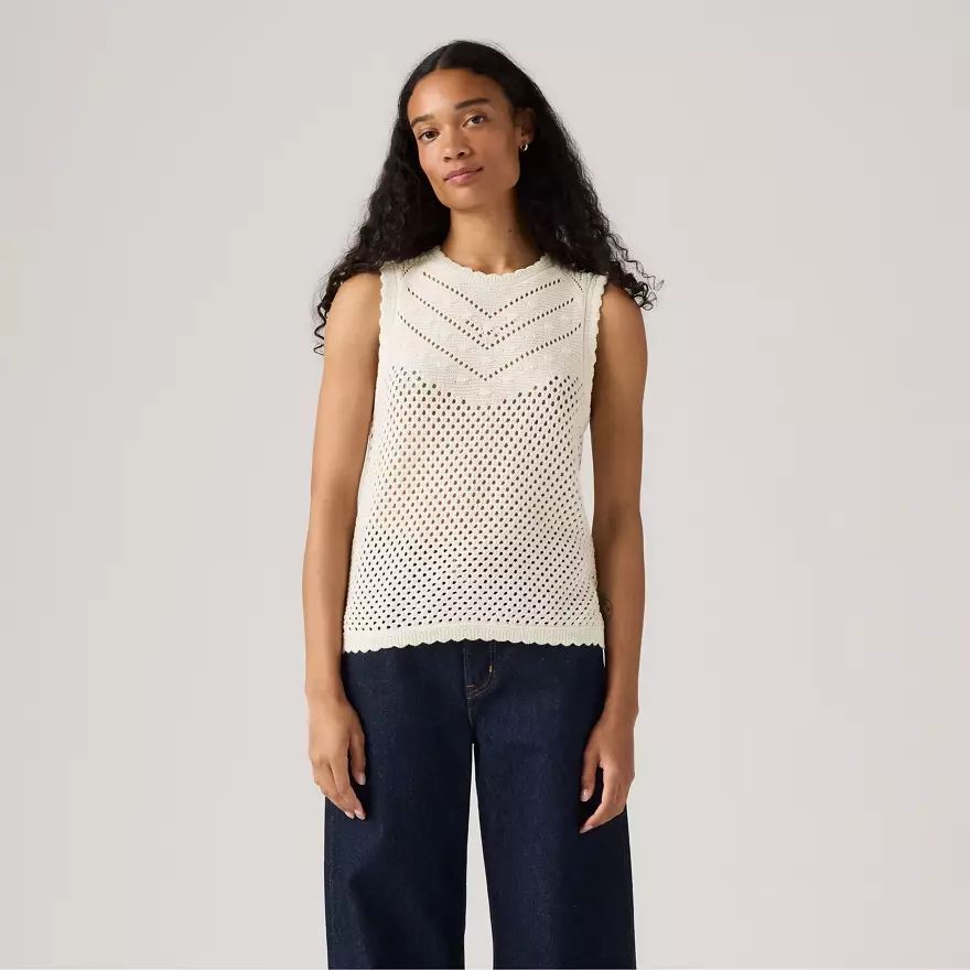 Notre débardeur Adrienne Crochet est à la fois fun et décontracté avec son encolure haute en maille crochetée et sa conception sans manche.
