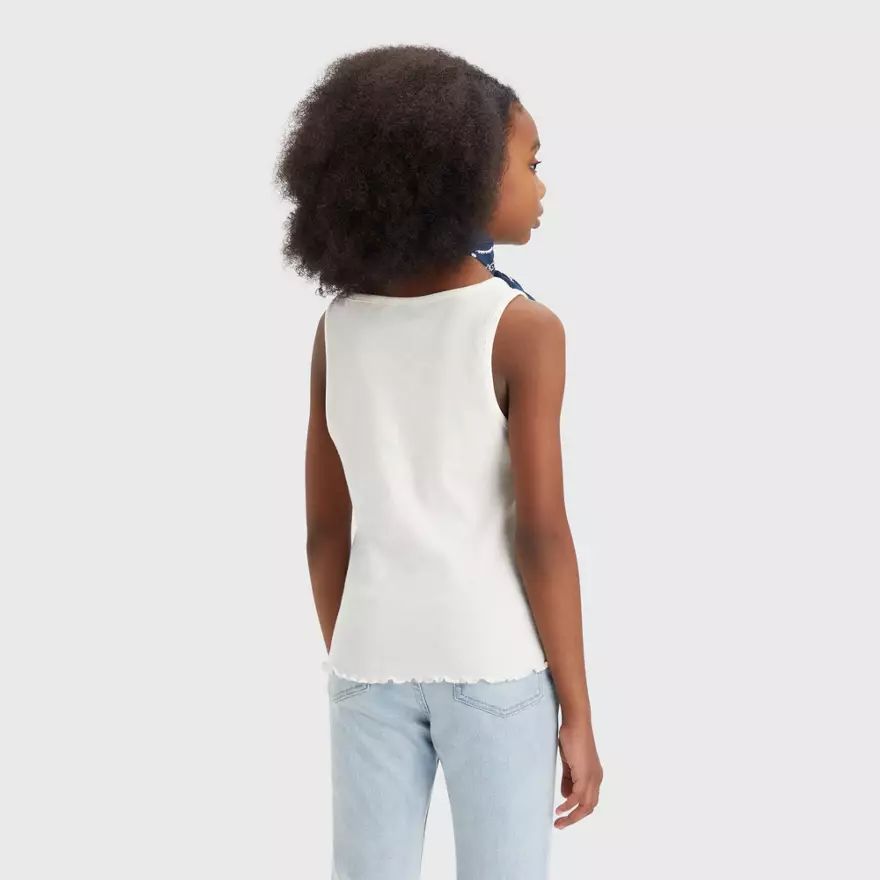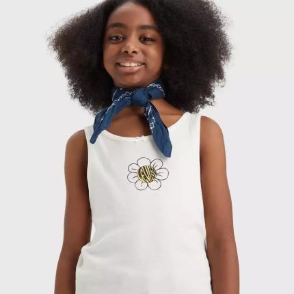 Un débardeur Levi's® en maille côtelée recouvert d’un imprimé de petites marguerites, avec une encolure dégagée ornée d’un petit nœud au centre et un ourlet roulotté à effet ondulé signent un look charmant inspiré des années 90.