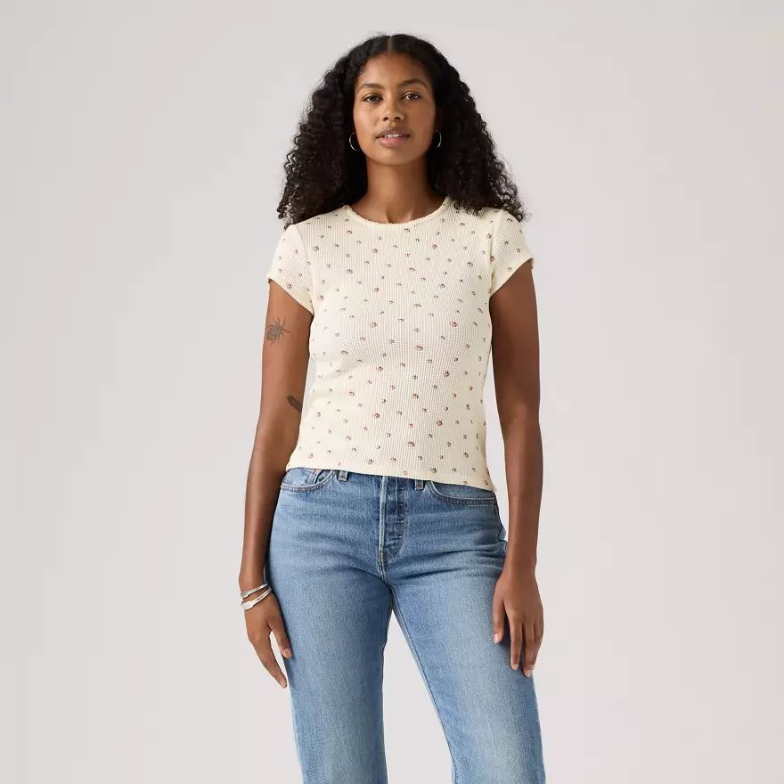 Ce t-shirt Cap-Sleeve est aussi confortable que pratique grâce à sa maille gaufrée, ses mancherons et sa coupe ajustée qui épouse la silhouette.