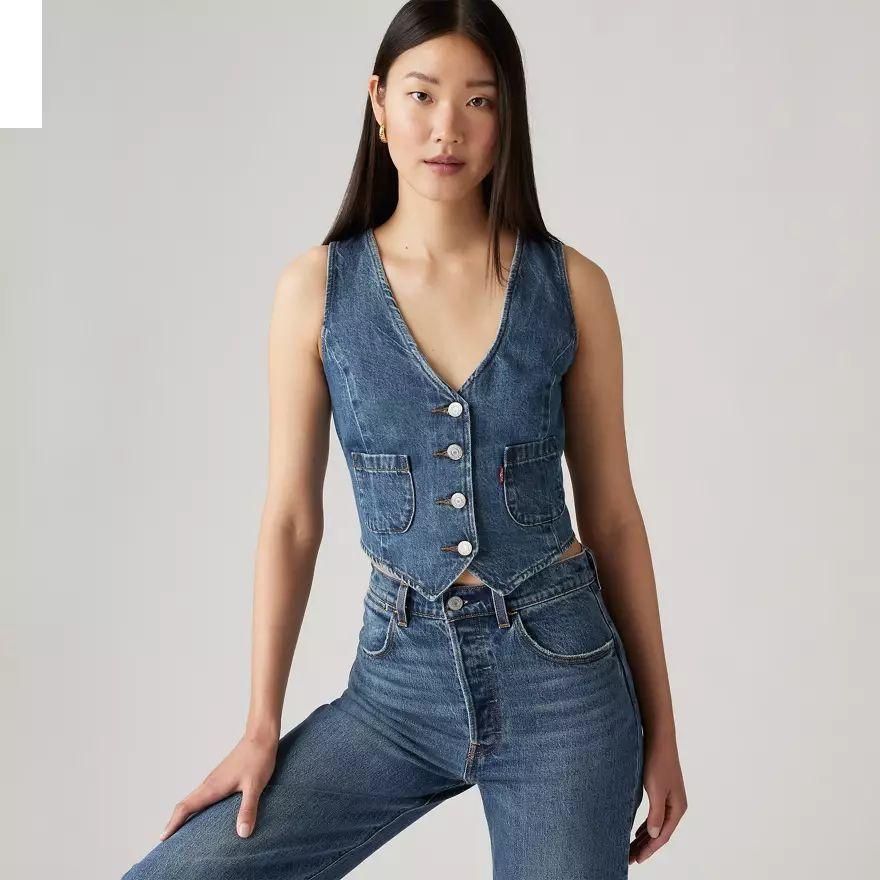 Un gilet sans manche en denim facile à porter