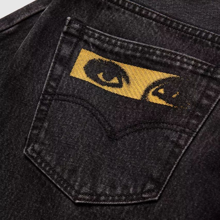 Ce jean baggy en édition limitée, au fit loose et relaxed, a un mélange de motifs imprimés et brodés sur les jambes.