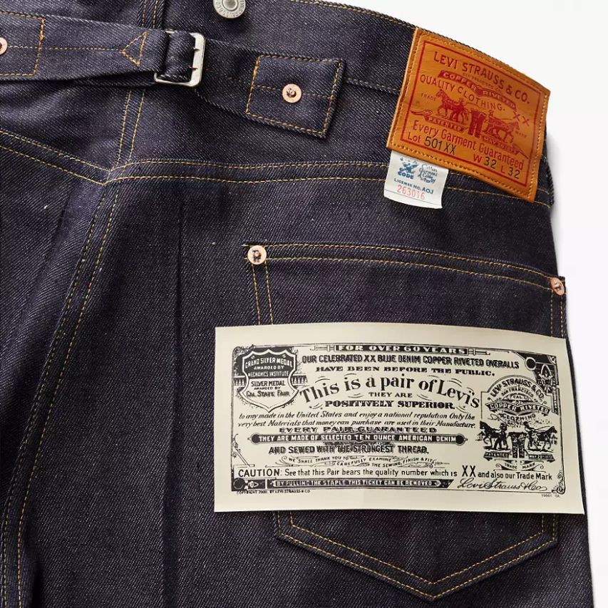 Notre jean 501® de 1933 présentait également la nouvelle « étiquette de garantie » sur la poche arrière du jean. Levi Strauss & Co. avait déposé le nom de marque « Levi's® » en 1927, car les pantalons en denim étaient généralement appelés « Levi's® », peu importe le nom du fabricant. Au lieu de lire : « C’en est un » (This is a pair of them »), comme on peut le voir sur l’étiquette d’origine de 1892, la nouvelle étiquette mentionnait : « C’est un Levi's® » (This Is A Pair Of Levi's® »). Sous le patch en cuir, il y avait aussi une petite étiquette en tissu blanc sur laquelle était imprimé l’aigle bleu et les lettres « NRA ». Il s’agissait du logo du National Recovery Act, que LS&Co. était autorisé à utiliser parce que la société respectait les règles du travail de la National Recovery Administration à la demande du président Franklin Roosevelt, au cours des années 1930, pendant la grande dépression.