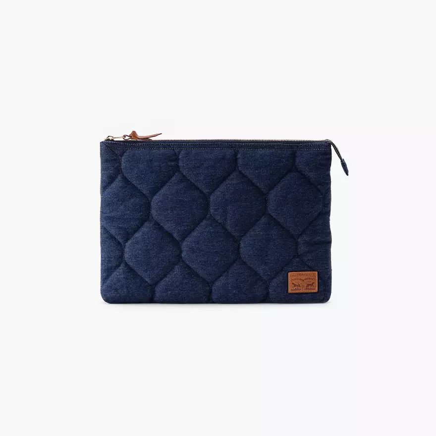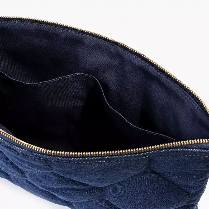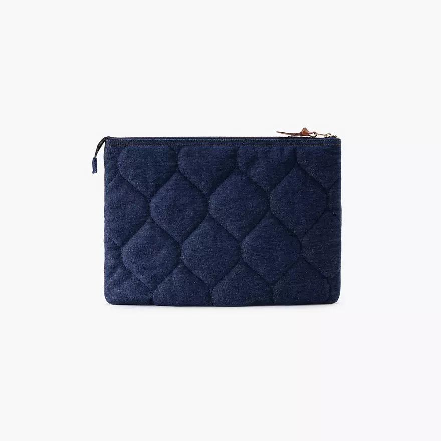 Classique, cette pochette en denim délavé peut accueillir un ordinateur portable de 15 pouces. Nous y avons ajouté de jolis détails, comme un patch en cuir et une tirette en cuir.