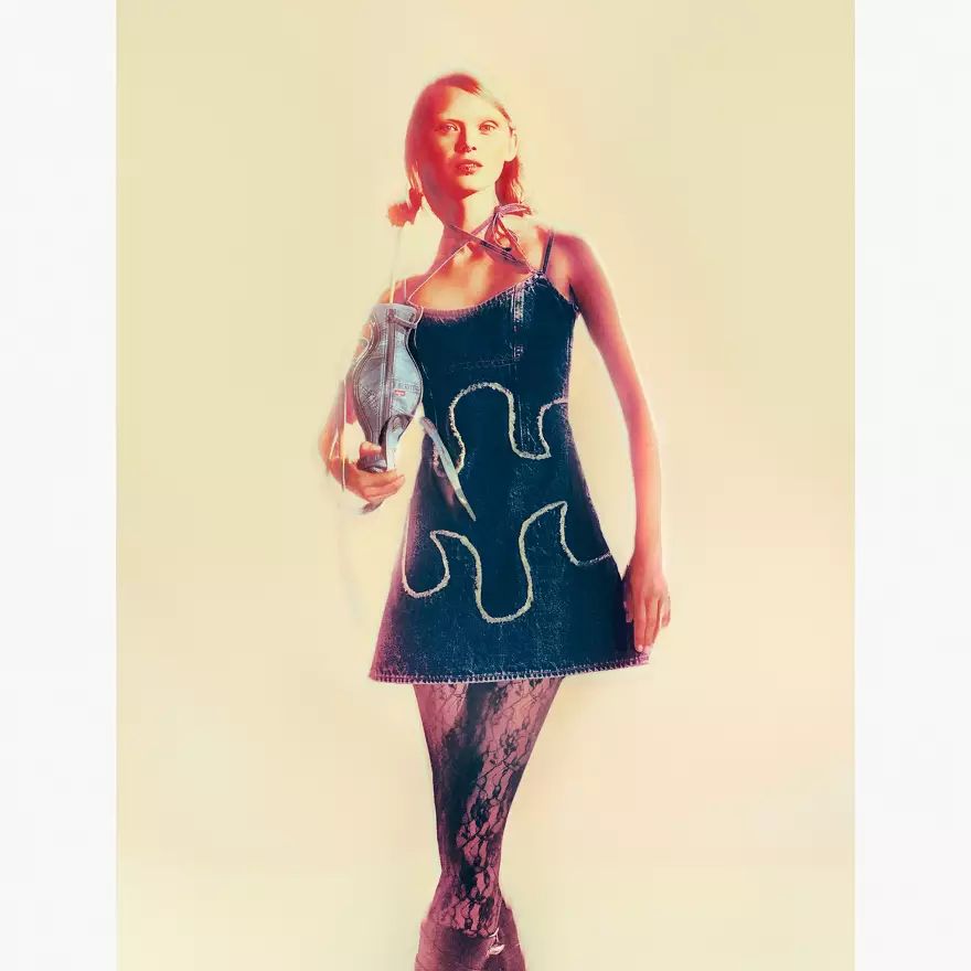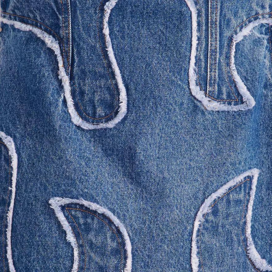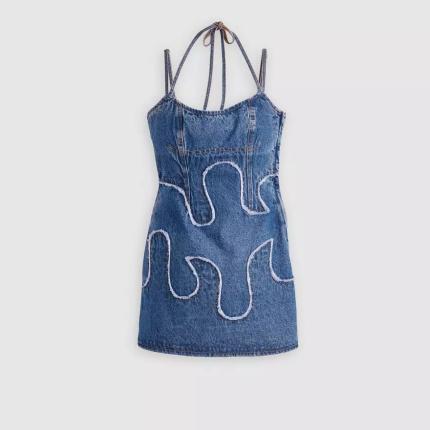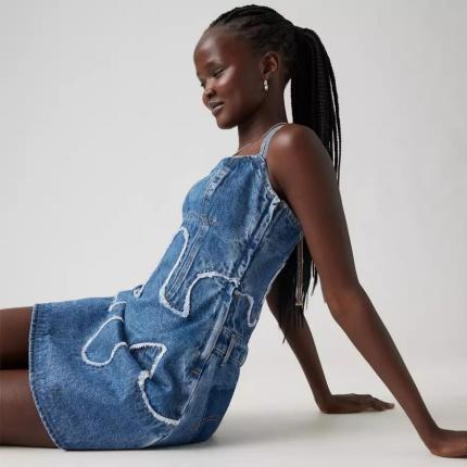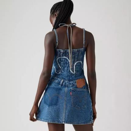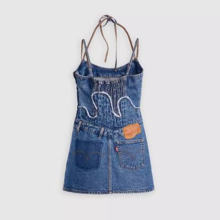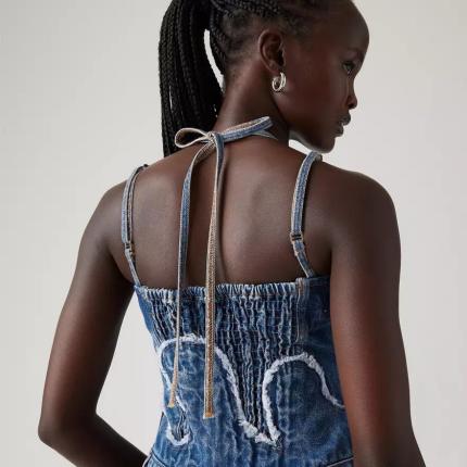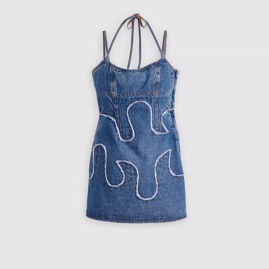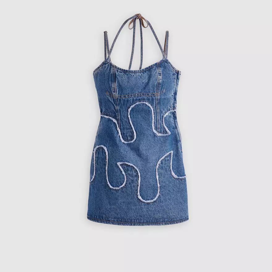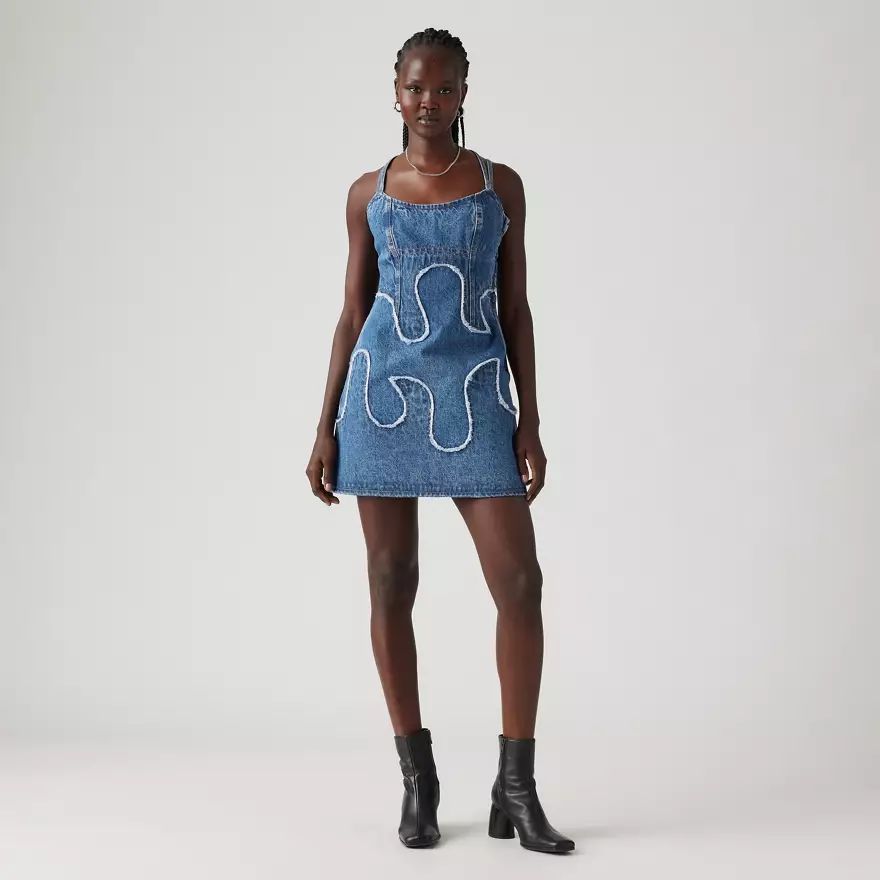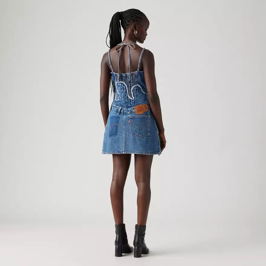 Cette Mini robe en édition limitée présente un motif patchwork ondulé, des bords effilochés et des détails bien pensés, comme un dos smocké pour un fit ultra-flatteur et des bretelles en denim ajustables.