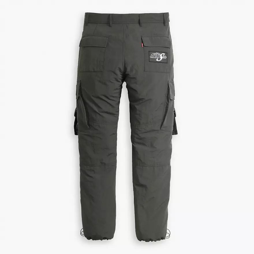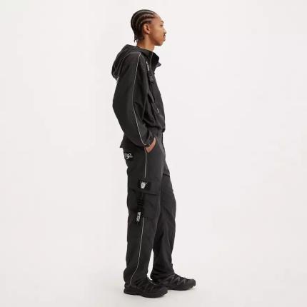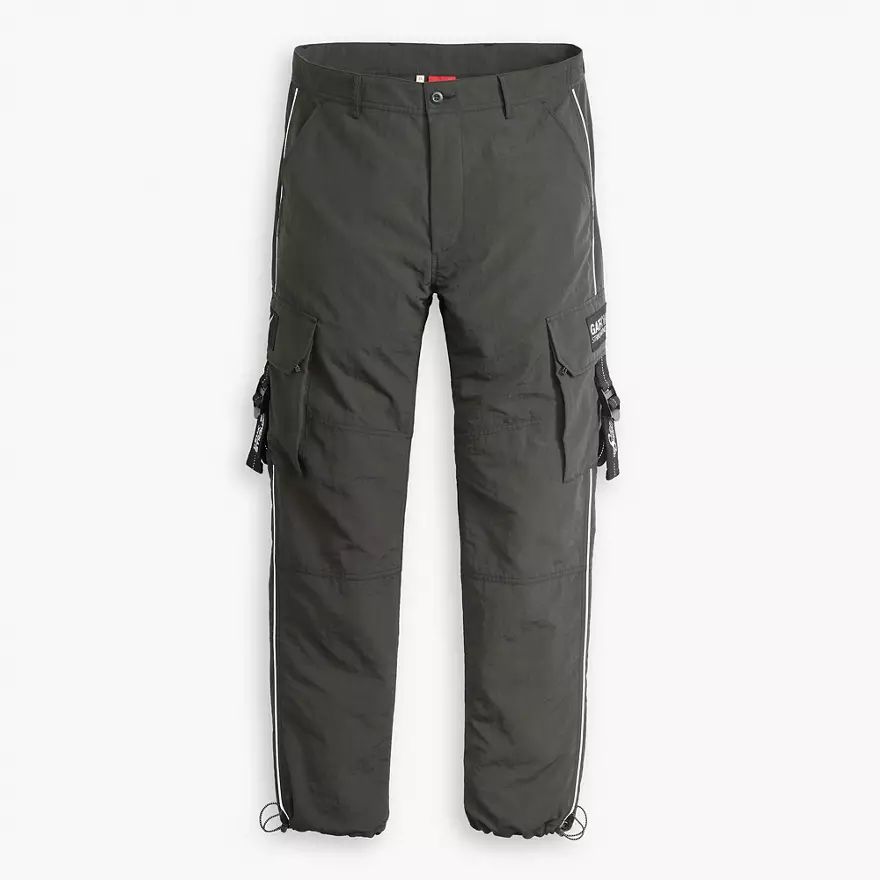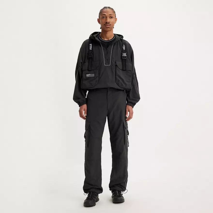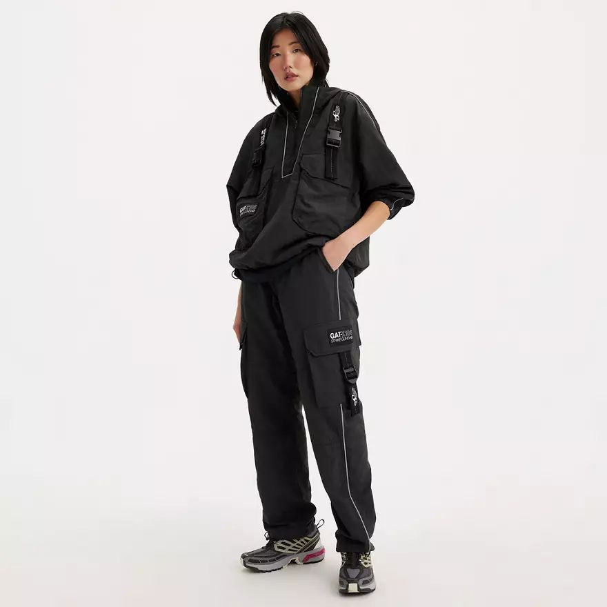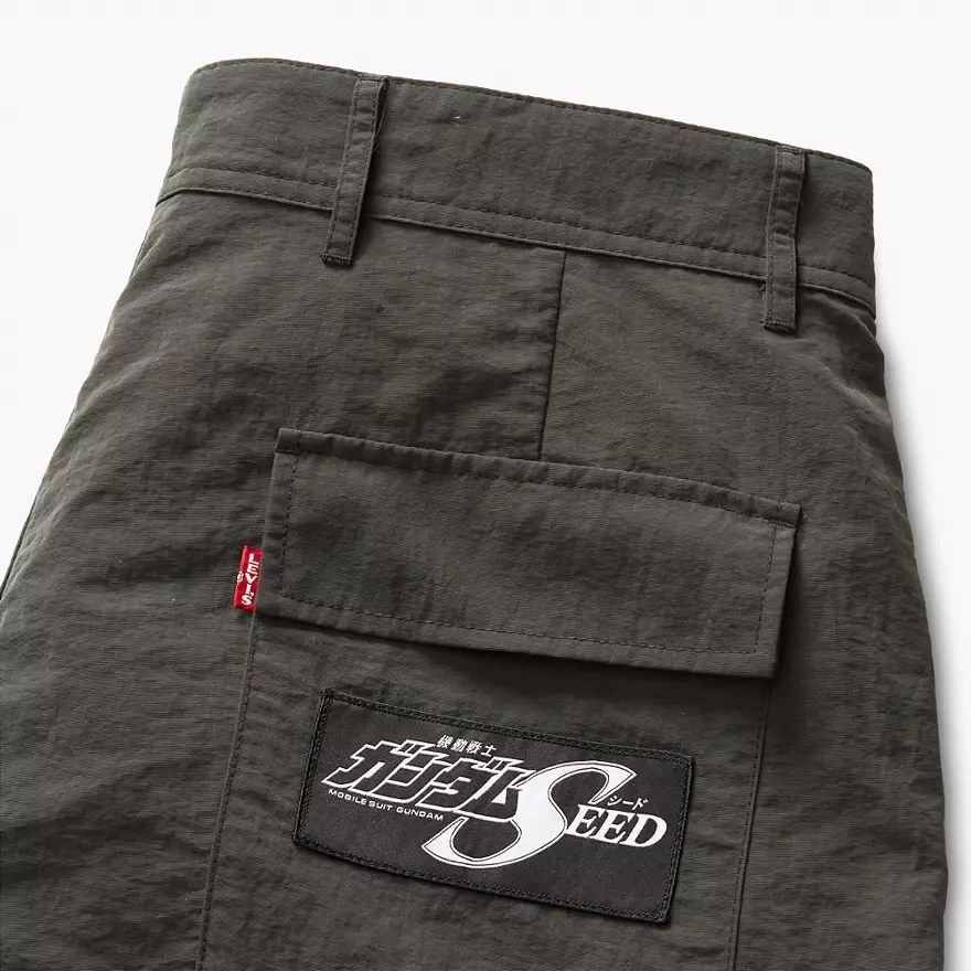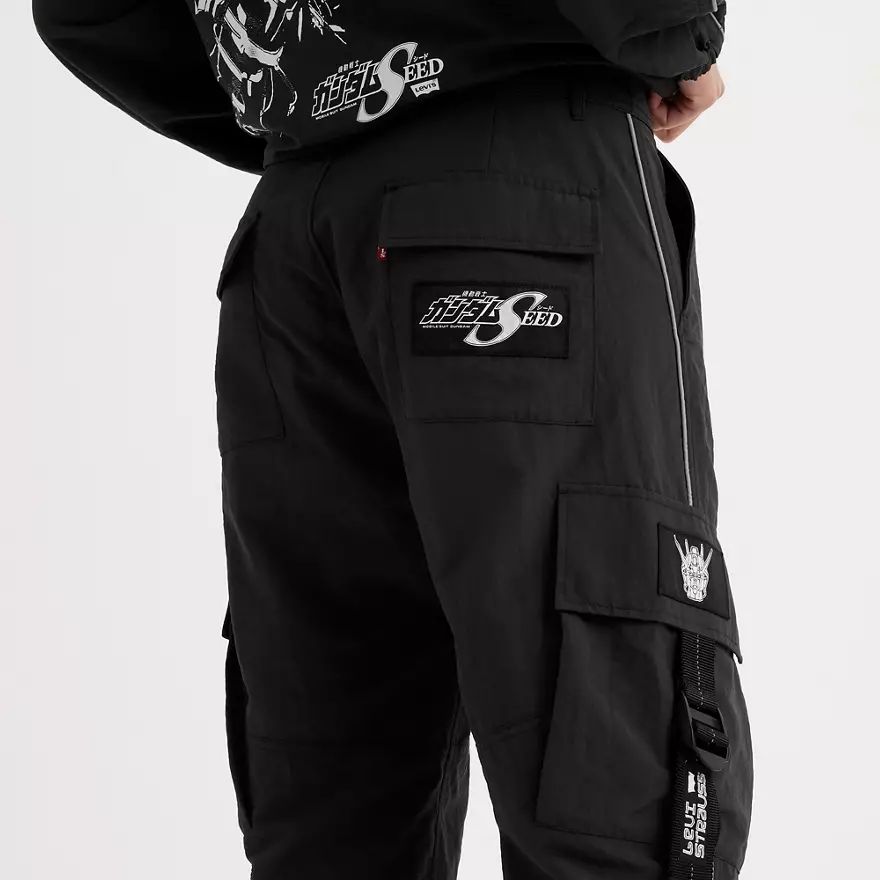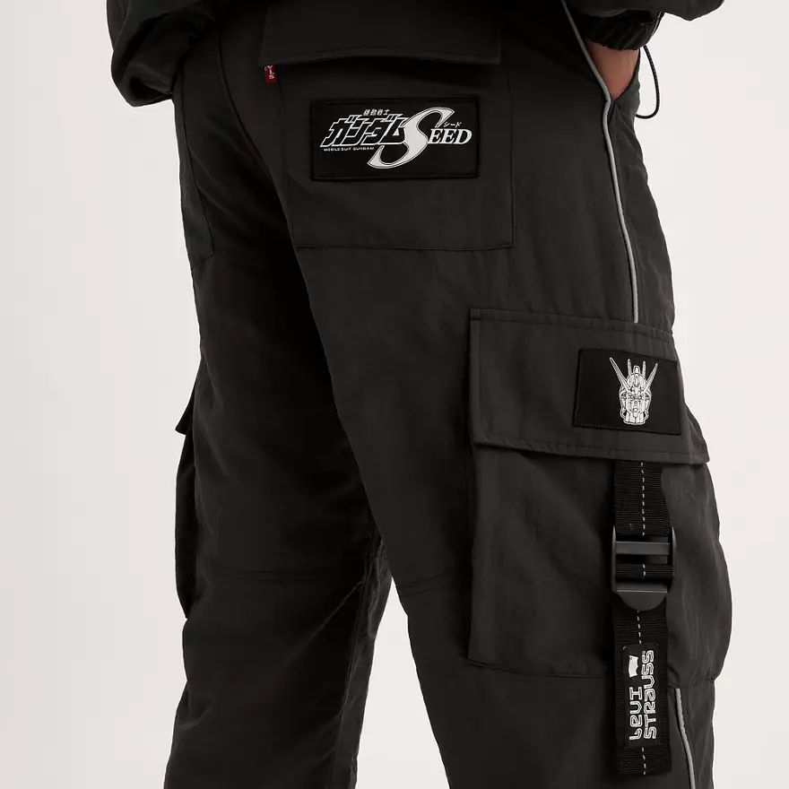 Ce pantalon cargo affiche un fit baggy, des passepoils argentés sur les coutures latérales et des patchs Gundam co-marqués sur les poches.