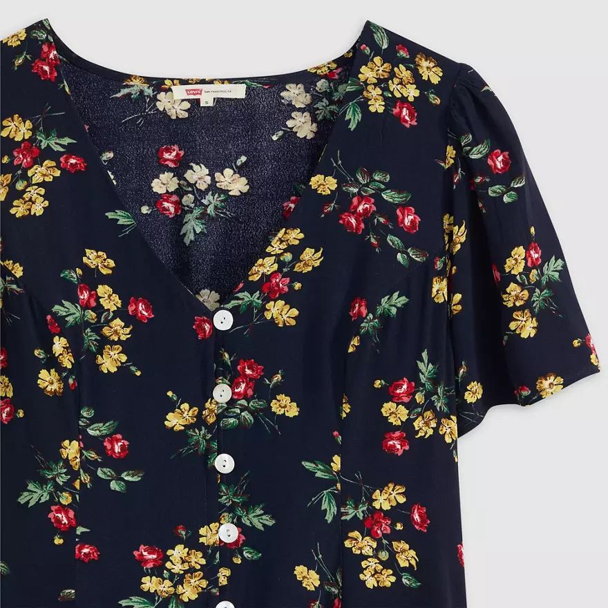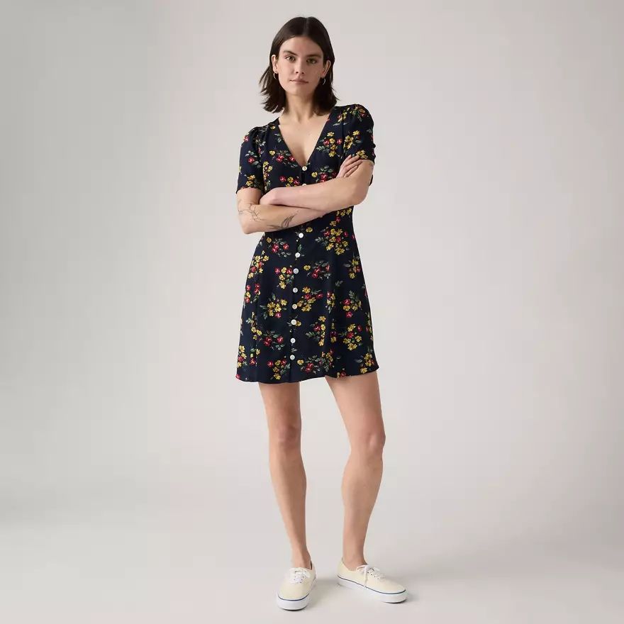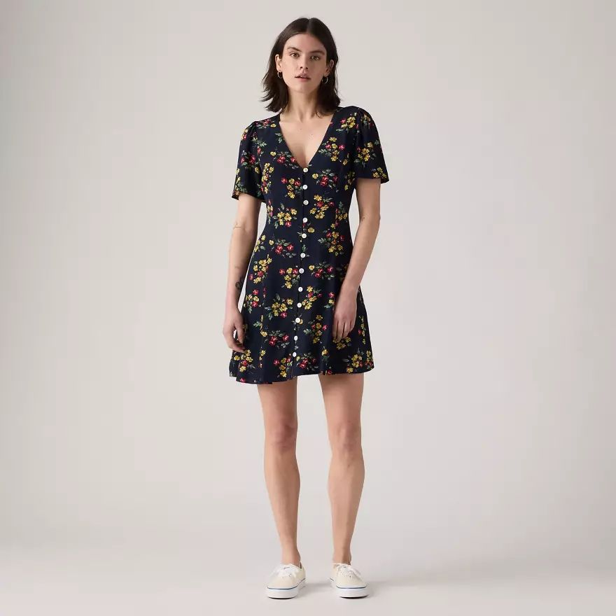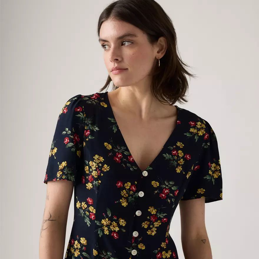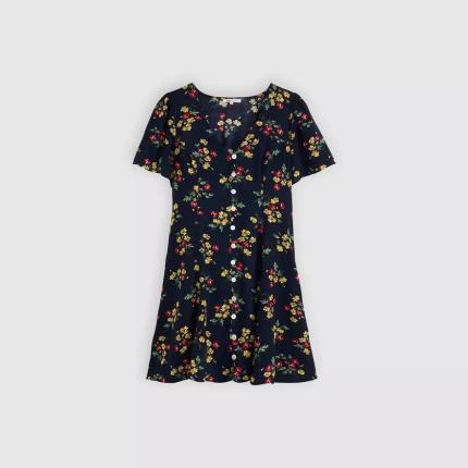 Notre robe courte manche courte Gianni est une pépite pour les beaux jours. Nous la proposons avec une encolure en V, une patte de boutonnage devant et une coupe ajustée.