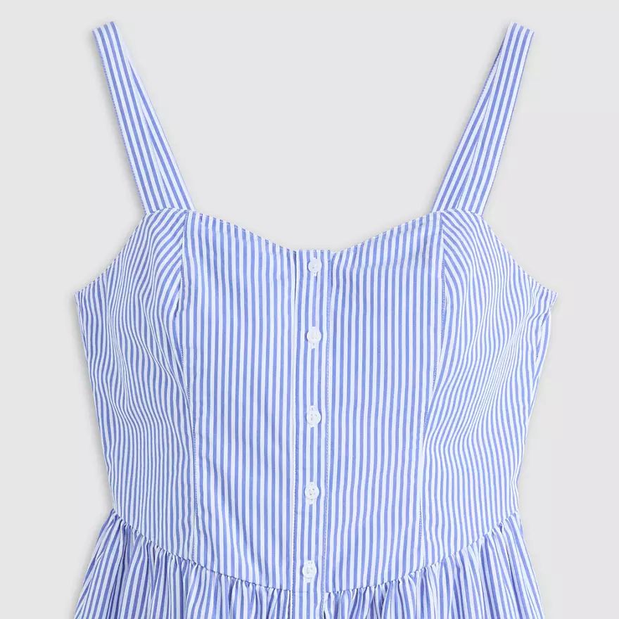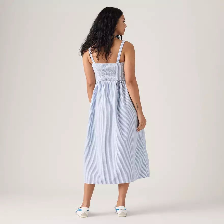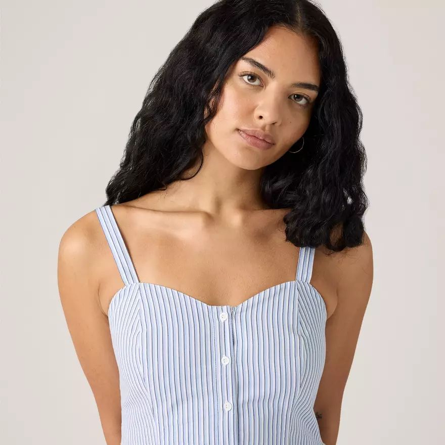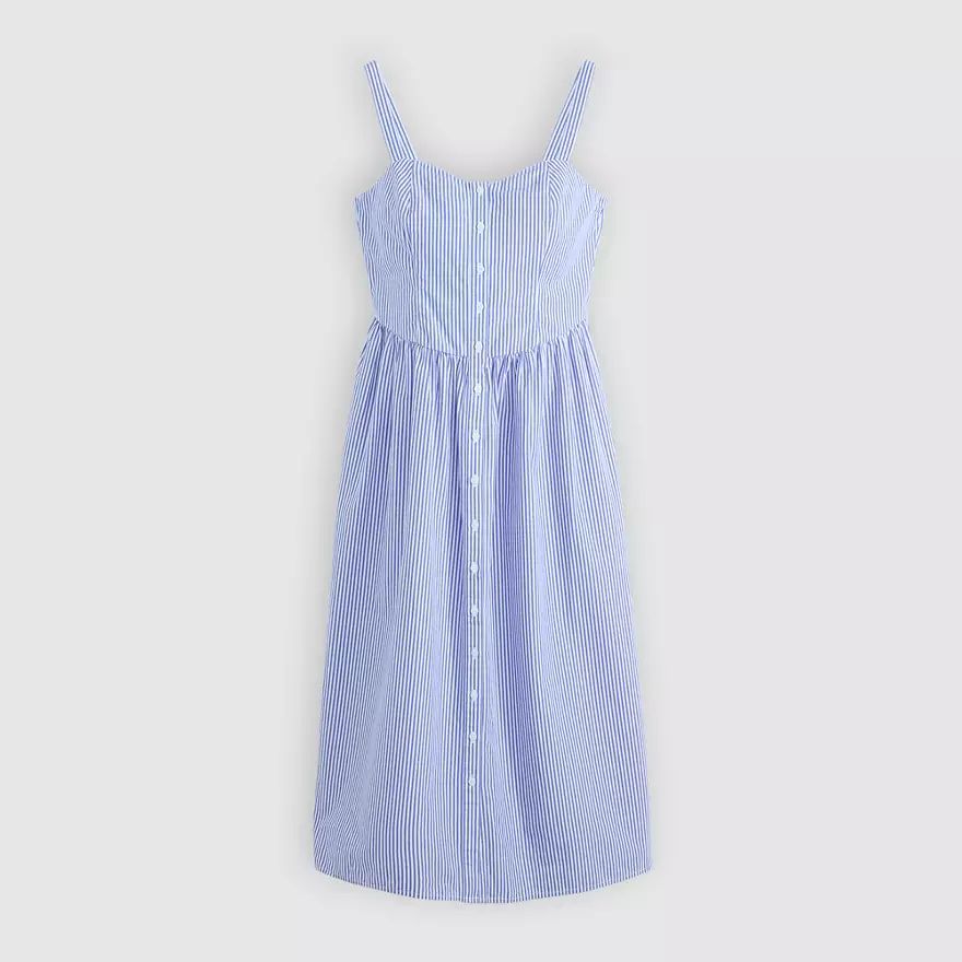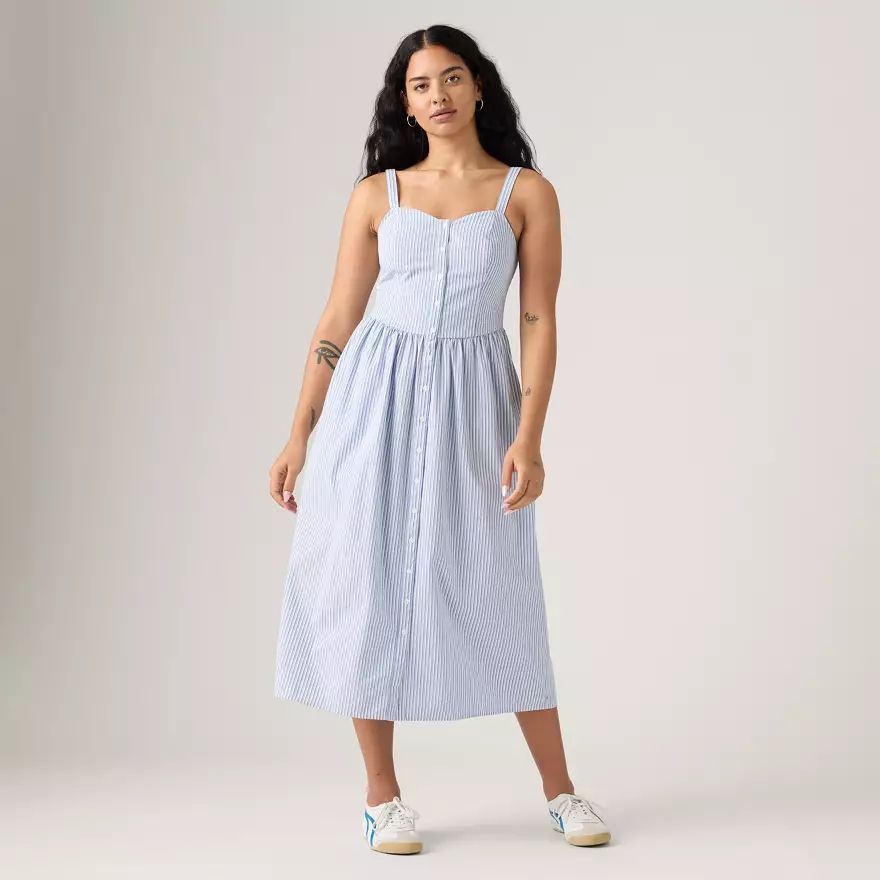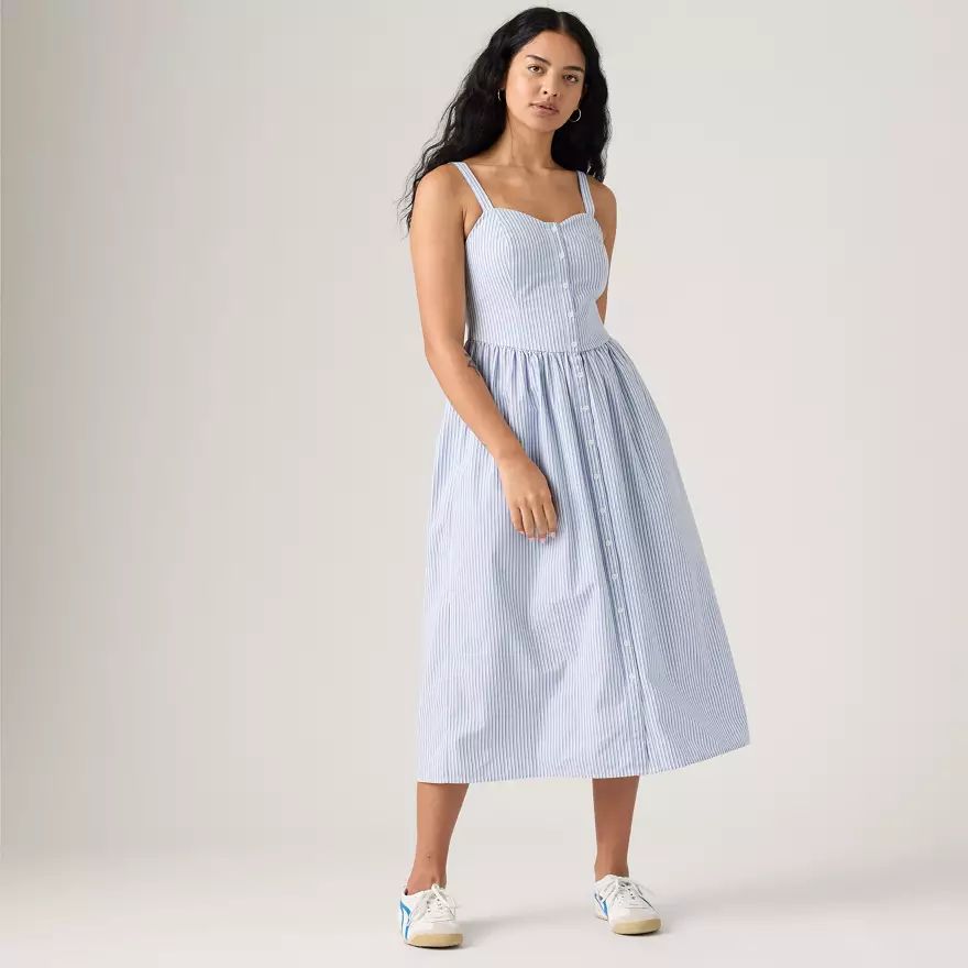 Nous avons repris un design bustier ultra-flatteur pour créer cette robe mi-longue Adore. Avec sa coupe ajustée, elle a des bretelles qui couvrent celles du soutien-gorge, une encolure en cœur et une patte de boutonnage devant.