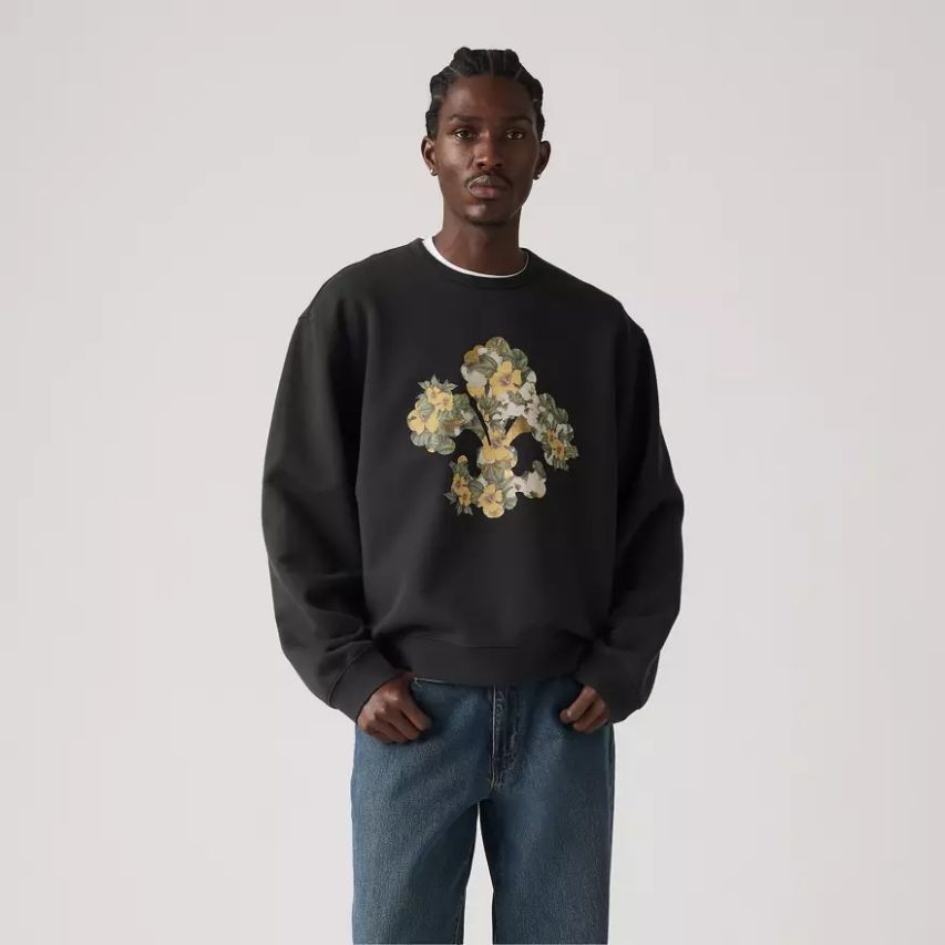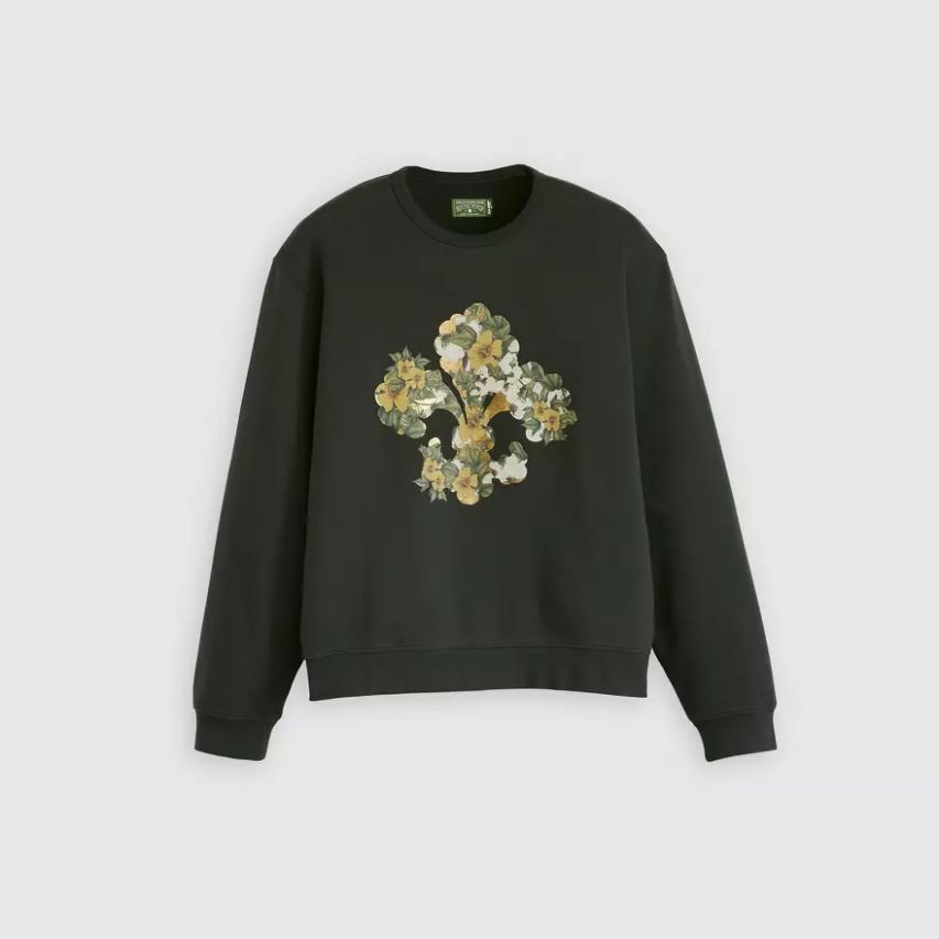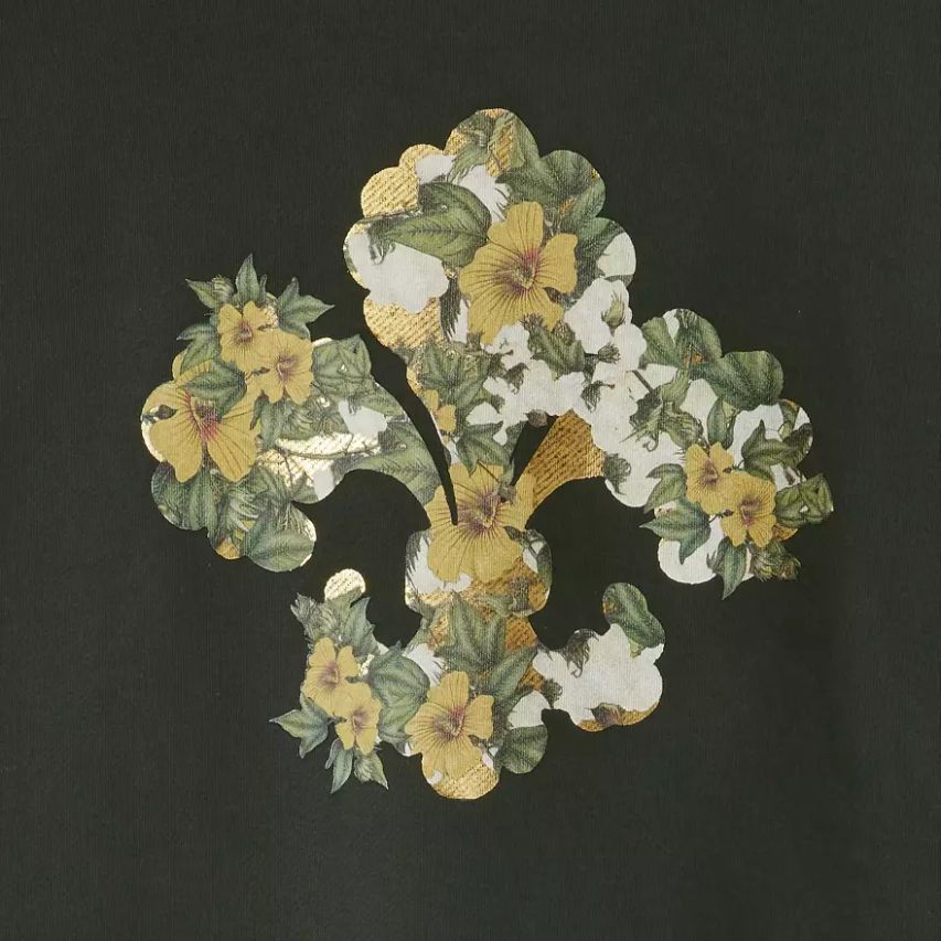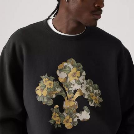 Ce sweat-shirt à col rond a une base noire délavée ornée du même motif en forme de fleur de lys en coton.
