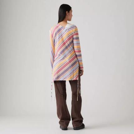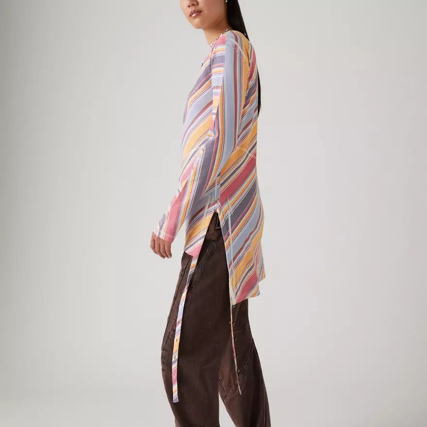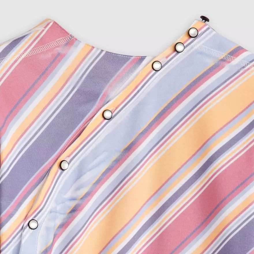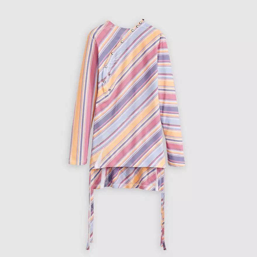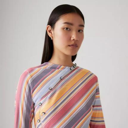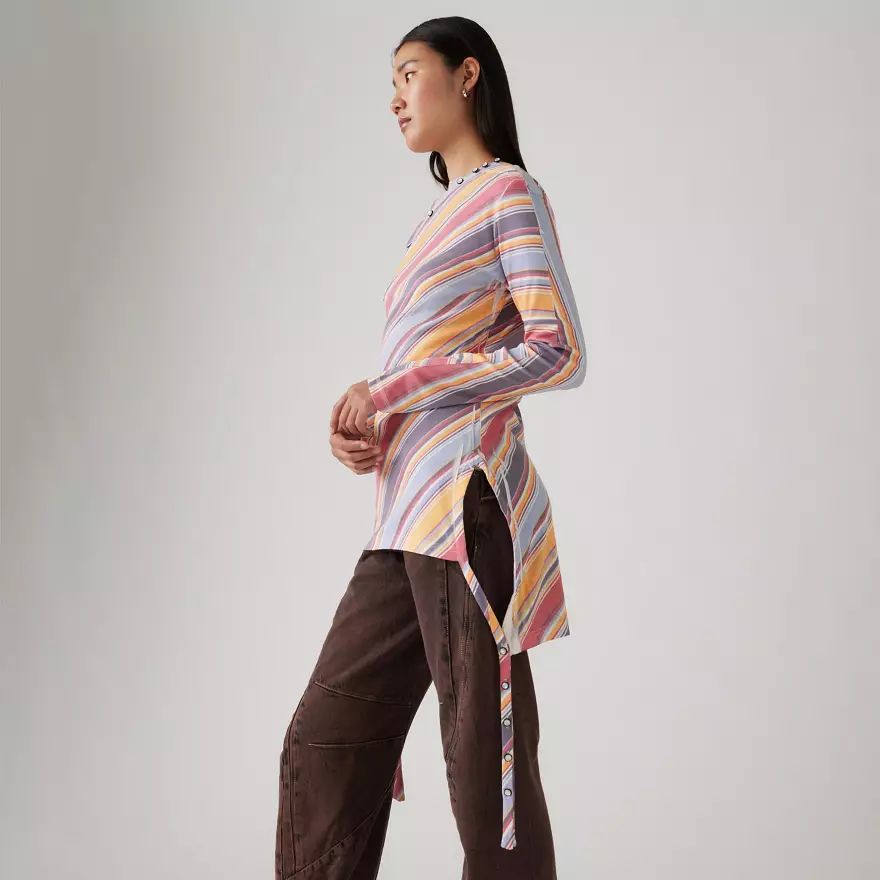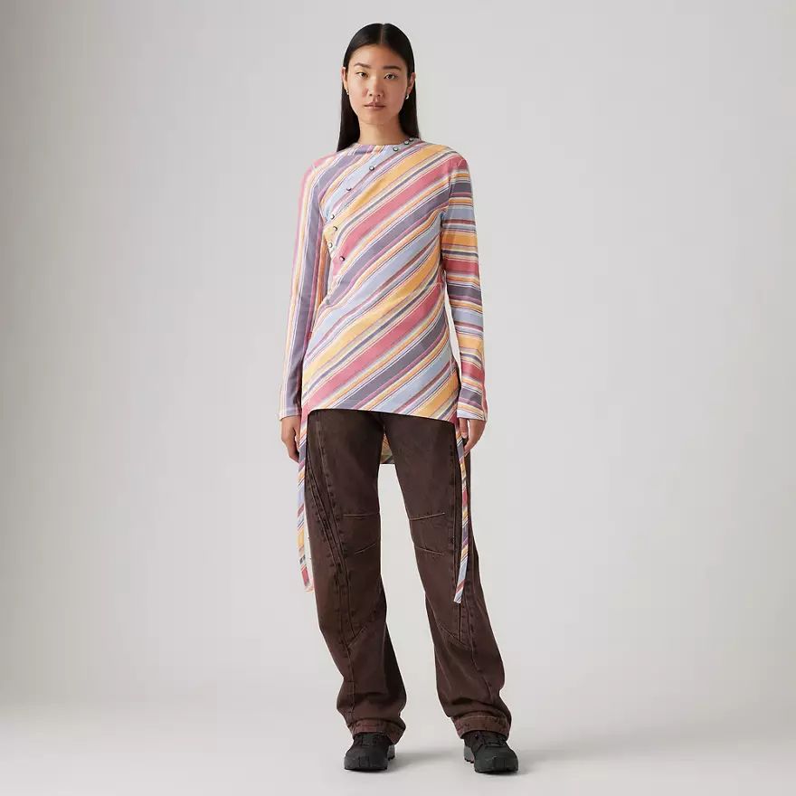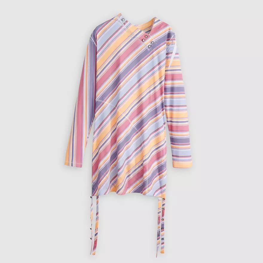 Pour ce t-shirt à col tunisien en jersey, en édition limitée, nous avons opté pour une encolure haute avec une patte de boutonnage décentrée et courbe, des boutons nacrés et des pampilles fantaisistes, le tout rehaussé d’un motif à rayures. Chaque pièce est imprimée individuellement pour un look vraiment unique.
