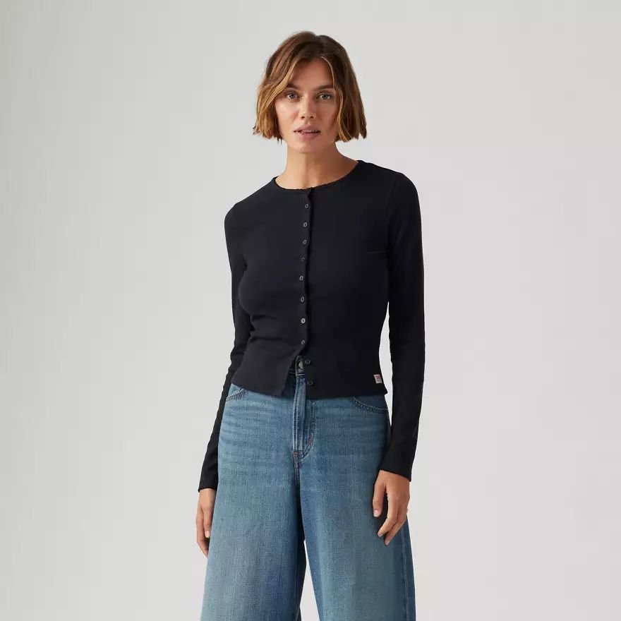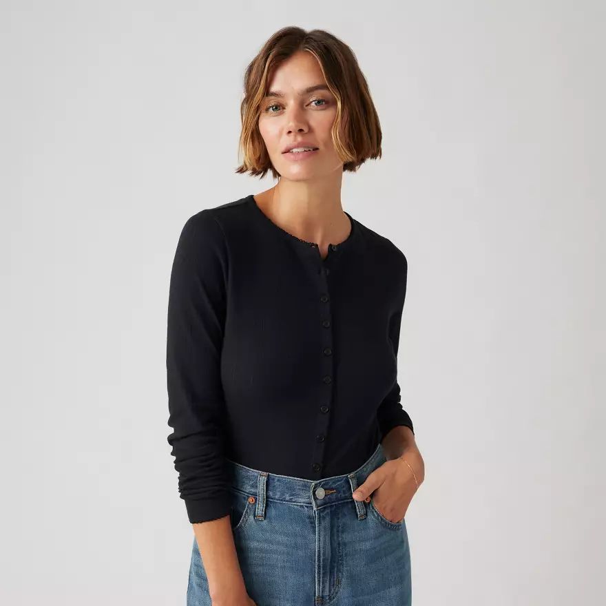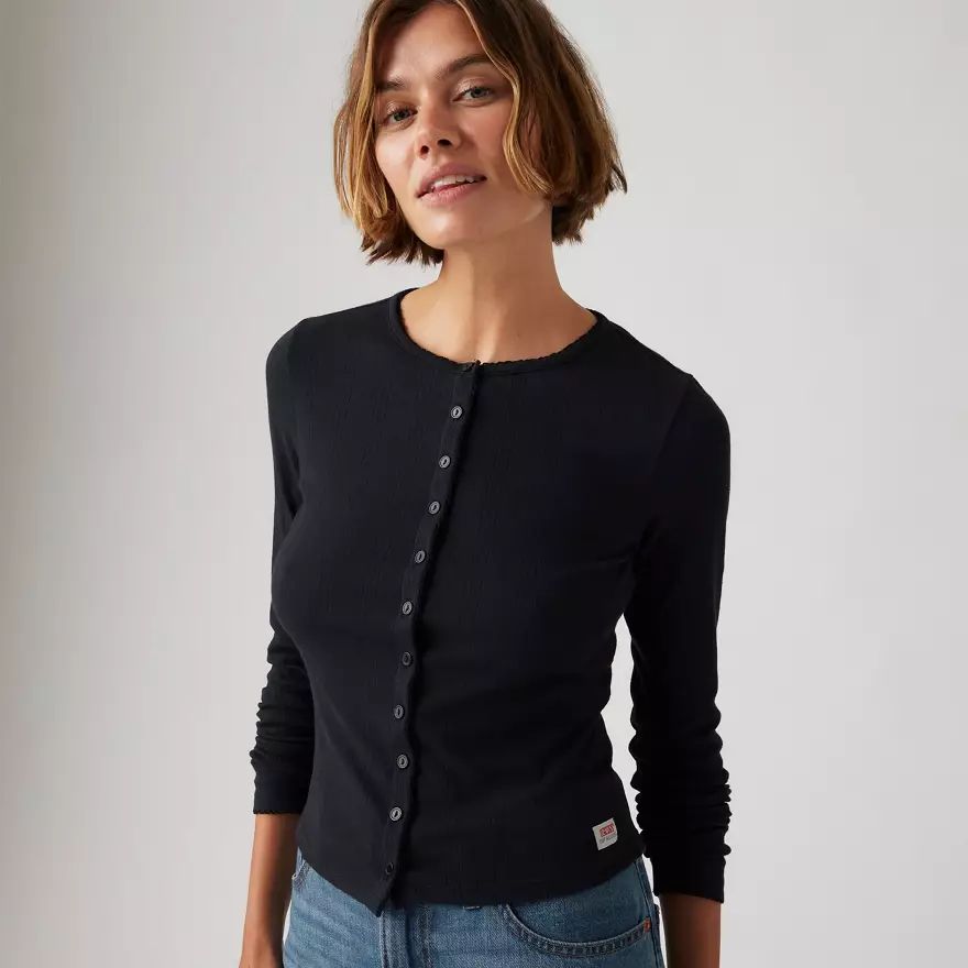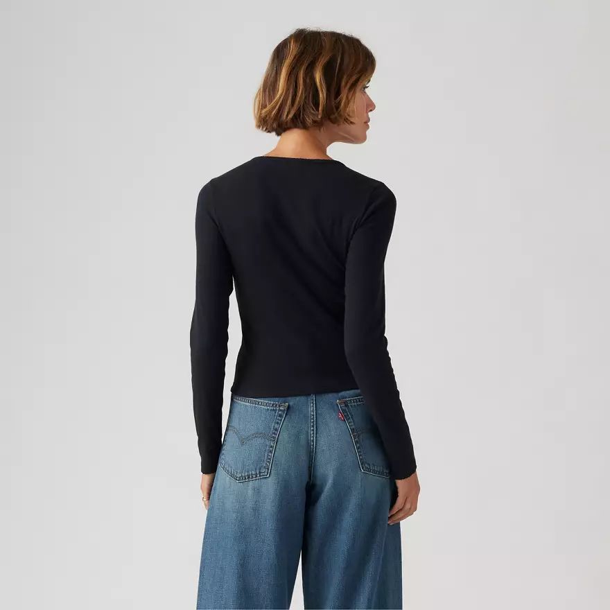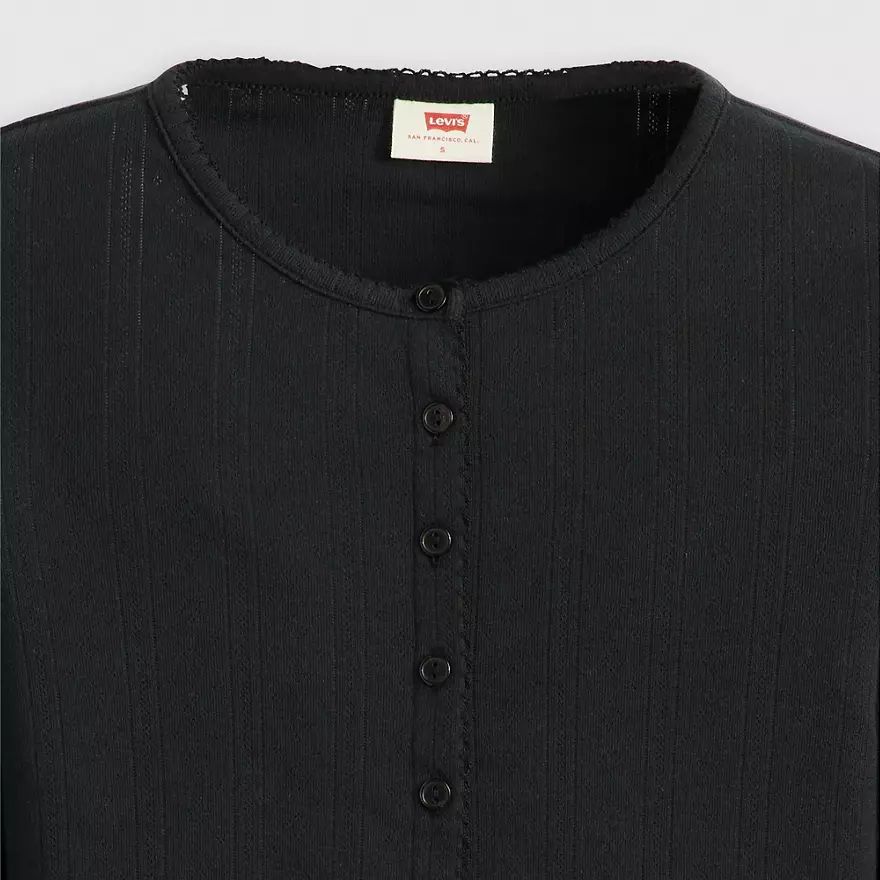 Découvrez le t-shirt Pointelle à manches longues orné de notre étiquette Dry Goods signature en bas à gauche. Avec ses boutons et sa silhouette ajustée, vous allez adorer le porter sur tous vos denims.