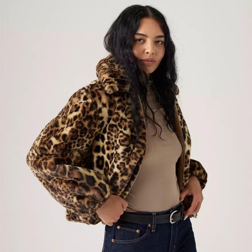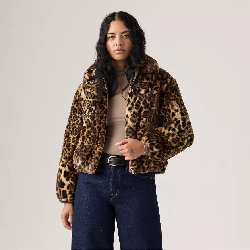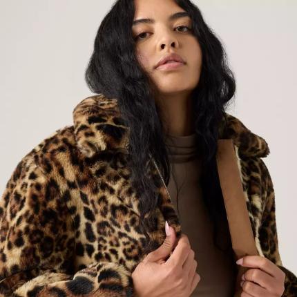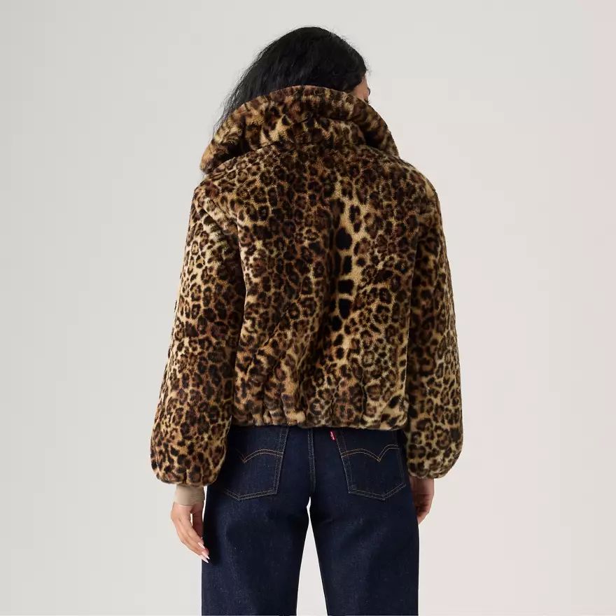 Une veste cosy en peau de mouton retournée revisitée avec un imprimé léopard. Notre veste Sherpa Leopard Elle a un col doux, une fermeture zippée devant et deux poches pratiques.