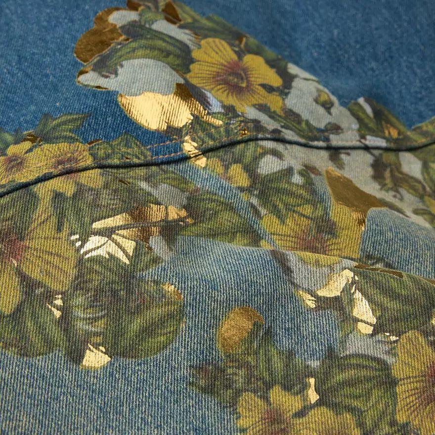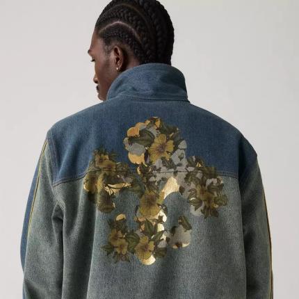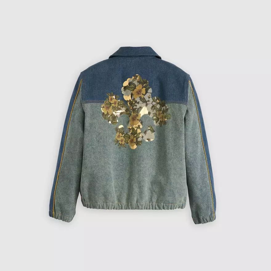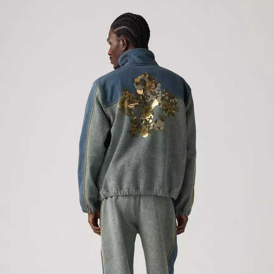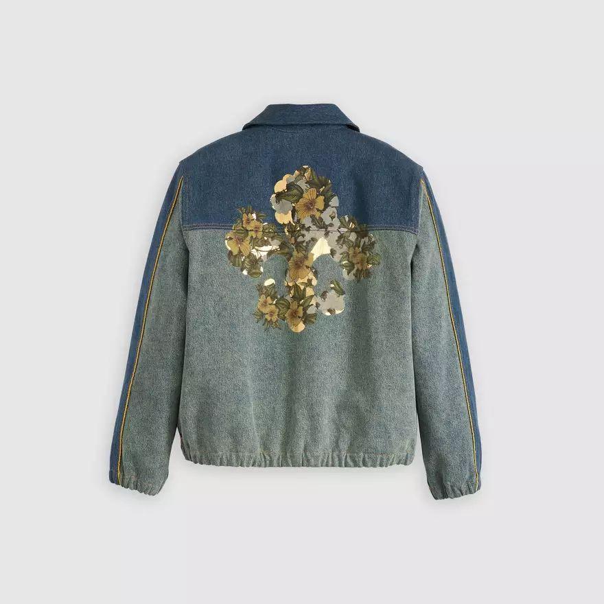 Inspirée de la mosaïque culturelle de La Nouvelle-Orléans, cette veste Track est délavée en indigo moyen avec des empiècements à délavage foncé et des fleurs de lys imprimées : un symbole profondément ancré dans les racines françaises de la ville.